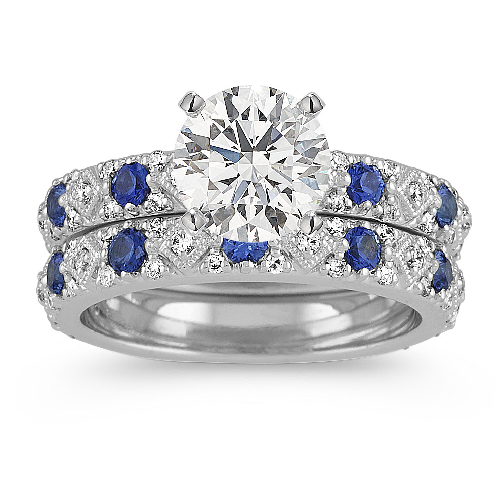 Traditional Blue Sapphire And Diamond Wedding Set In 14k White Gold