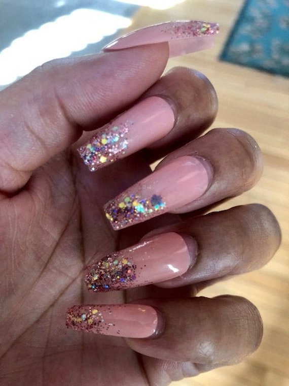 Light Peachy Pink Ombre And Glitter On Long Coffin Nails Nail