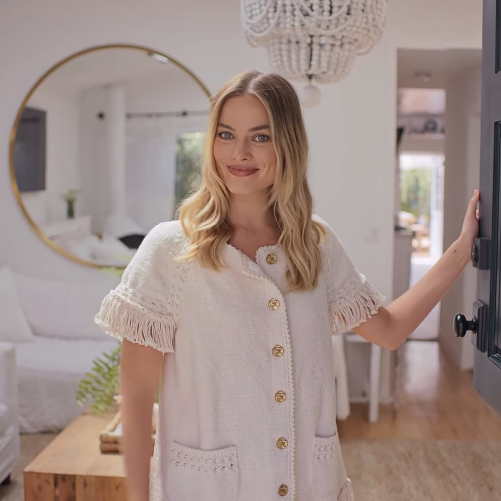 Margot Robbie Looks Radiant In A Chanel Sweater And Flared Denim